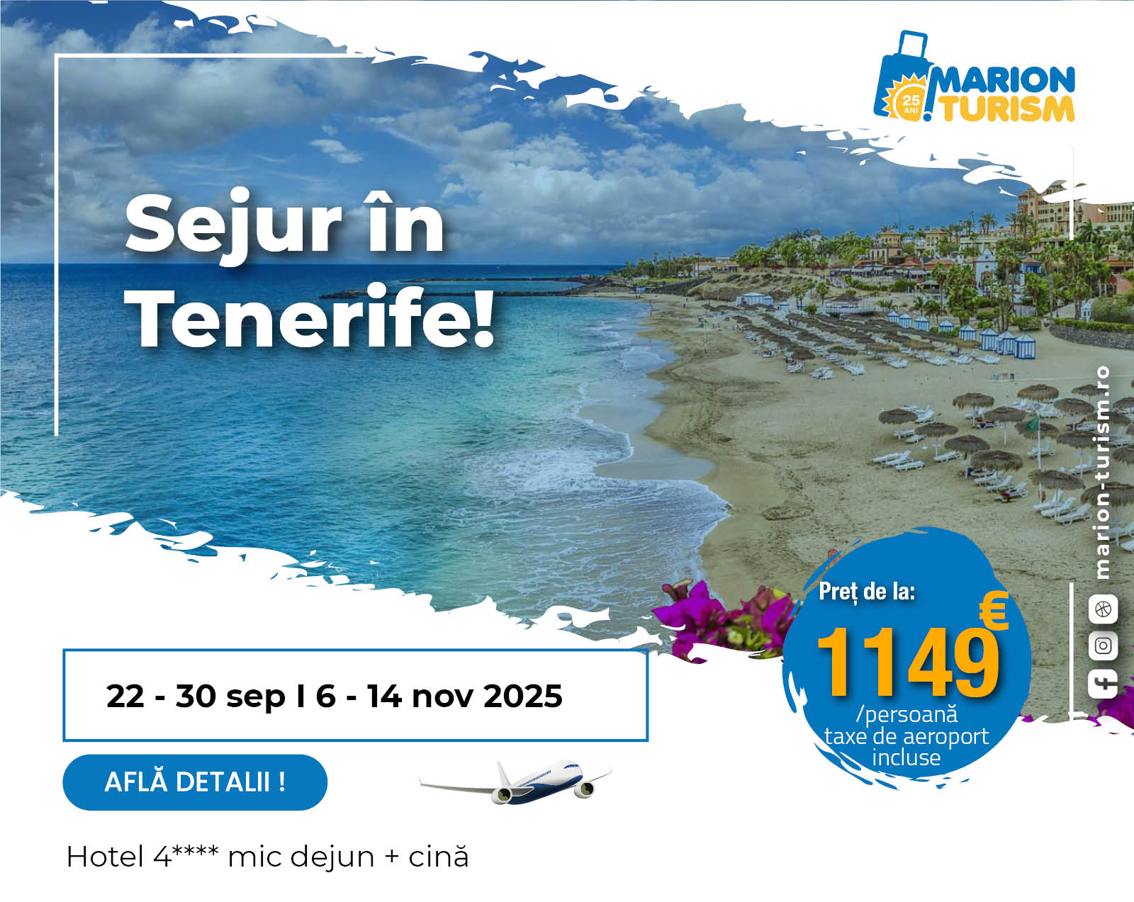Transfer autocar/minibus de la Iaşi la Otopeni. Îmbarcare pe zborul companiei WizzAir, cu destinaţia Tenerife (decolare la ora locală 14:20, sosire în Tenerife la ora locală 17:35). Transfer la hotel.