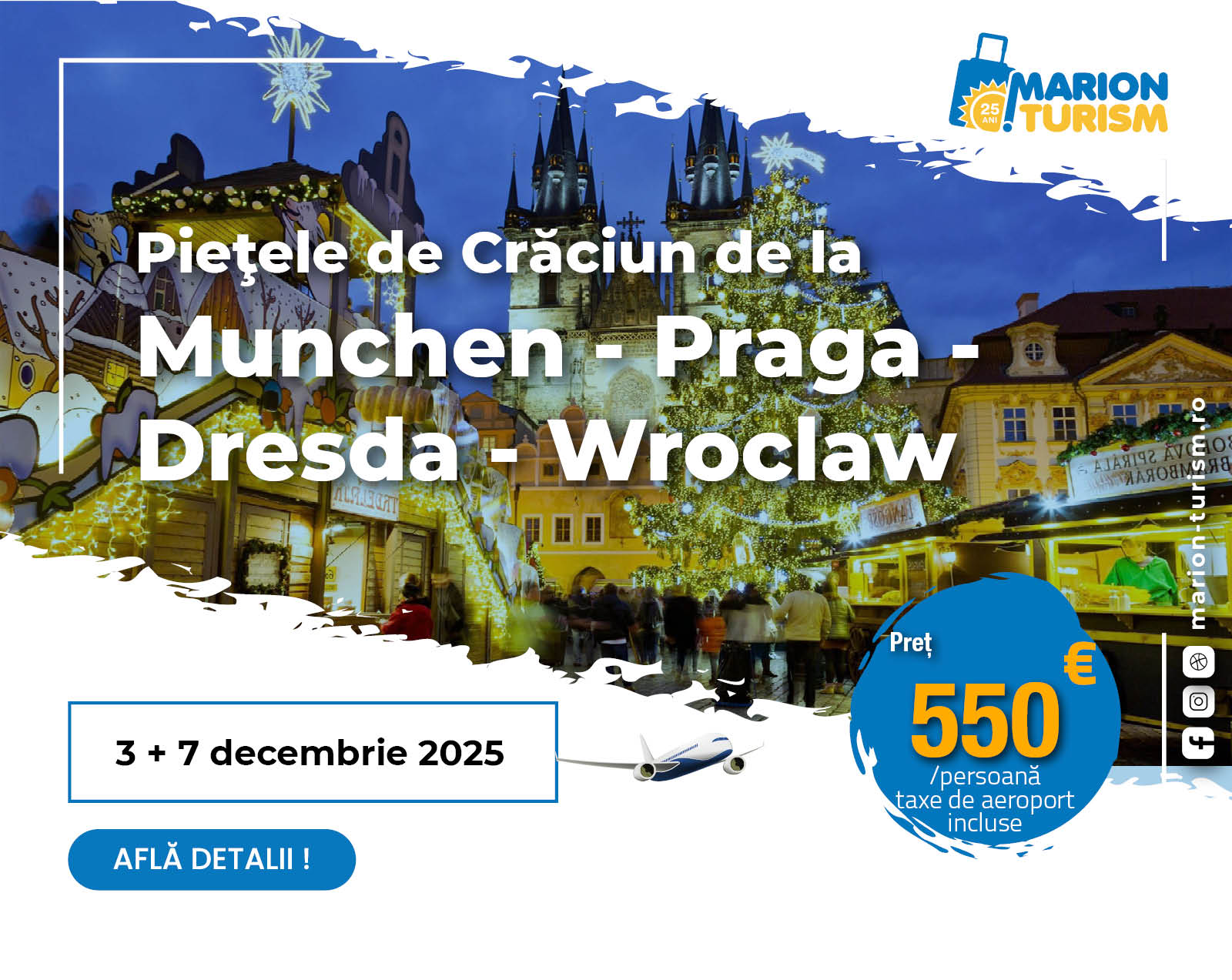 Întâlnire cu însoţitorul de grup la Aeroportul Internaţional Iaşi pentru îmbarcare pe cursa WizzAir, cu destinaţia Memmingen – Munchen Vest (decolare la ora locală 05:00, sosire în Memmingen – Munchen Vest la ora locală 06:25). Transfer în Munchen. Vizităm orașul Munchen împreună cu ghidul local (din autocar şi pietonal): Piața Marienplatz, Catedrala Frauenkirche (construită în 1488), Deutches Museum, Biserica „Sfântul Petru”, Karlplatz, Parcul Olimpic, Stadionul Allianz Arena, Palatul Regal, Teatrul Național, Arcul de Triumf etc. Timp liber în Piaţa de Crăciun de la Munchen.