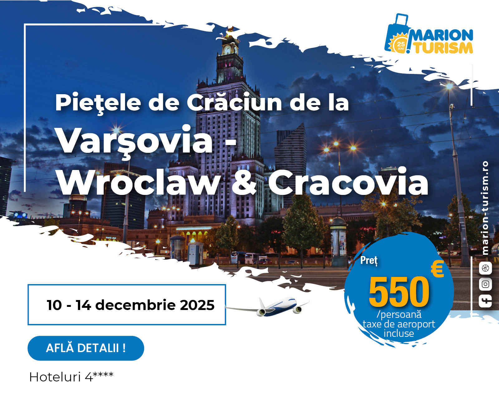 Transfer autocar/minibus de la Iaşi la Chişinău. Îmbarcare pe zborul companiei WizzAir, cu destinaţia Varşovia (decolare din Chişinău la ora locală 14:40, sosire în Varşovia la ora locală 15:30). Transfer în Varşovia, unde vom avea timp liber în Piaţa de Crăciu.